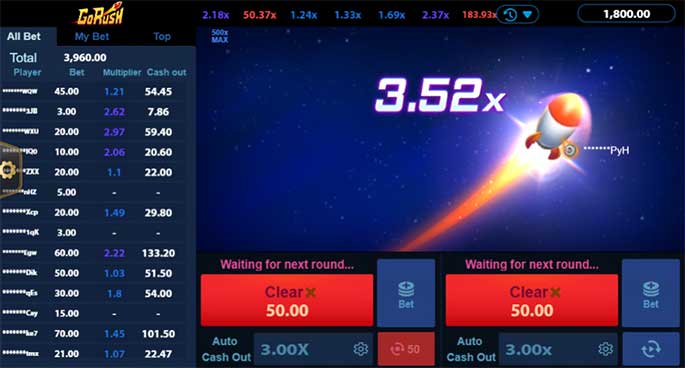 *Hệ số nhân ban đầu của Go Rush là 1.01x và tăng lên khi tên lửa cất cánh. Tổng tiền thắng cược sẽ là mức đặt cược nhân với hệ số nhân thắng cược, lên đến 500 lần.